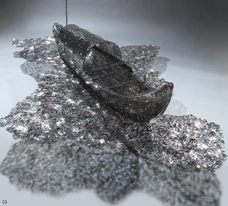 在材料的薄厚程度与坚硬度之间找到一个平衡点,在保证形体的坚固度的前提下,将材料的厚度控制在最薄处。同时,金属材料在焊接后所产生的应力会使在视觉上看似零碎残破的表面坚硬异常。这样,在材料属性上,我们又会产生一种视觉心理上的错位:它们是破碎的,还是完整的?它们是偶然的,还是必然的?它们是现象的,还是本质的?