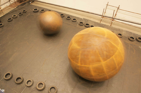 隋建国:这个展览的主展场是今日美术馆二楼的大空间,三十米长、十五米宽,十二米五高。整个展览应该是一件大作品,可以被看成是相互有机联系着的两个部分:一个部分是在周围墙上悬挂在空中的这么一个钢管通道系统,通道里有钢球在滚动和撞击;另外一个部分是地面上的两个大球,也在滚动。地上的这两个个球里面有机械装置,一旦开启,就会不停地转,大概能转七、八个小时。它们在不同的区域里面转悠,各自有一个直径大约六米左右的转动范围。两个球有时候也会互相撞击,有时候可能也会撞到墙根的脚手架上。